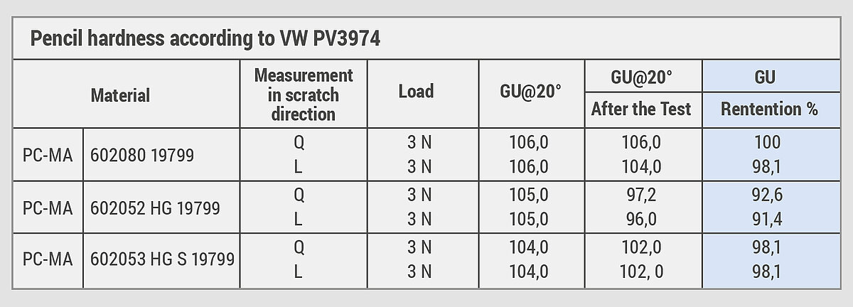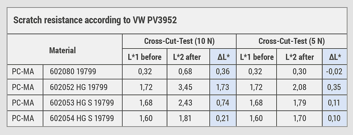 As demonstrated in the table below, PC-MA also boasts very good scratch resistance. ROMILOY® PC-MA 602080 in particular is highly impressive due to its outstanding gloss and deep black color intensity, while its excellent heat resistance allows it to be used extensively throughout the automotive sector.
