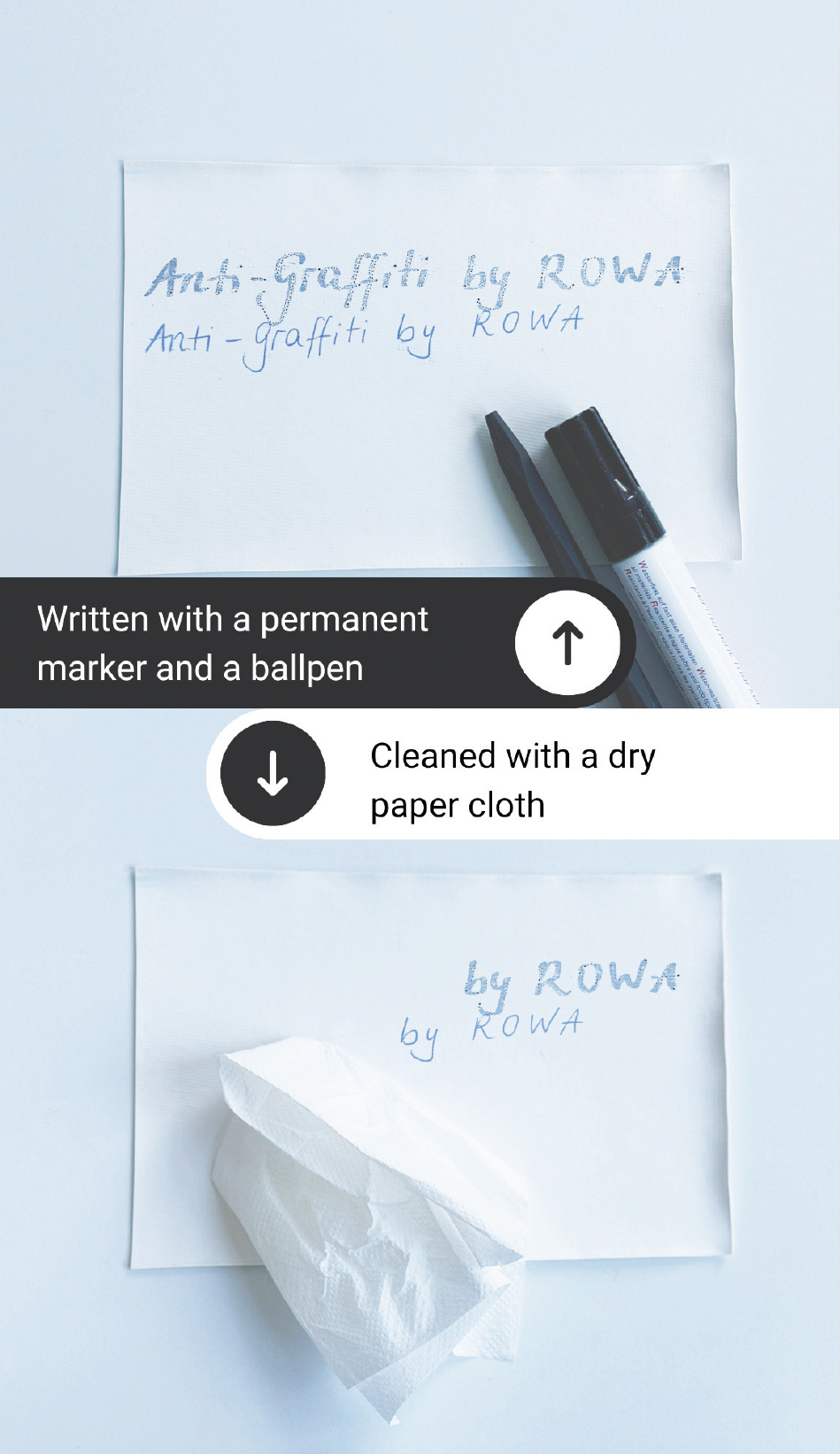 The materials coated with the anti-graffiti systems presented here have high scratch resistance and also exhibit very good resistance to solvents and chemicals. In addition, surfaces coated with ROWAKRYL® M‑35200W, ROWAKRYL® M‑35252W or ROWAKRYL® G‑35294W are characterized by a low soiling tendency and very good cleaning properties: Dried permanent marker or ballpoint pen ink can usually be removed effortlessly and residue-free from a coated artificial leather surface with a dry cloth. Even spray paint can be removed without leaving any residue in many cases.